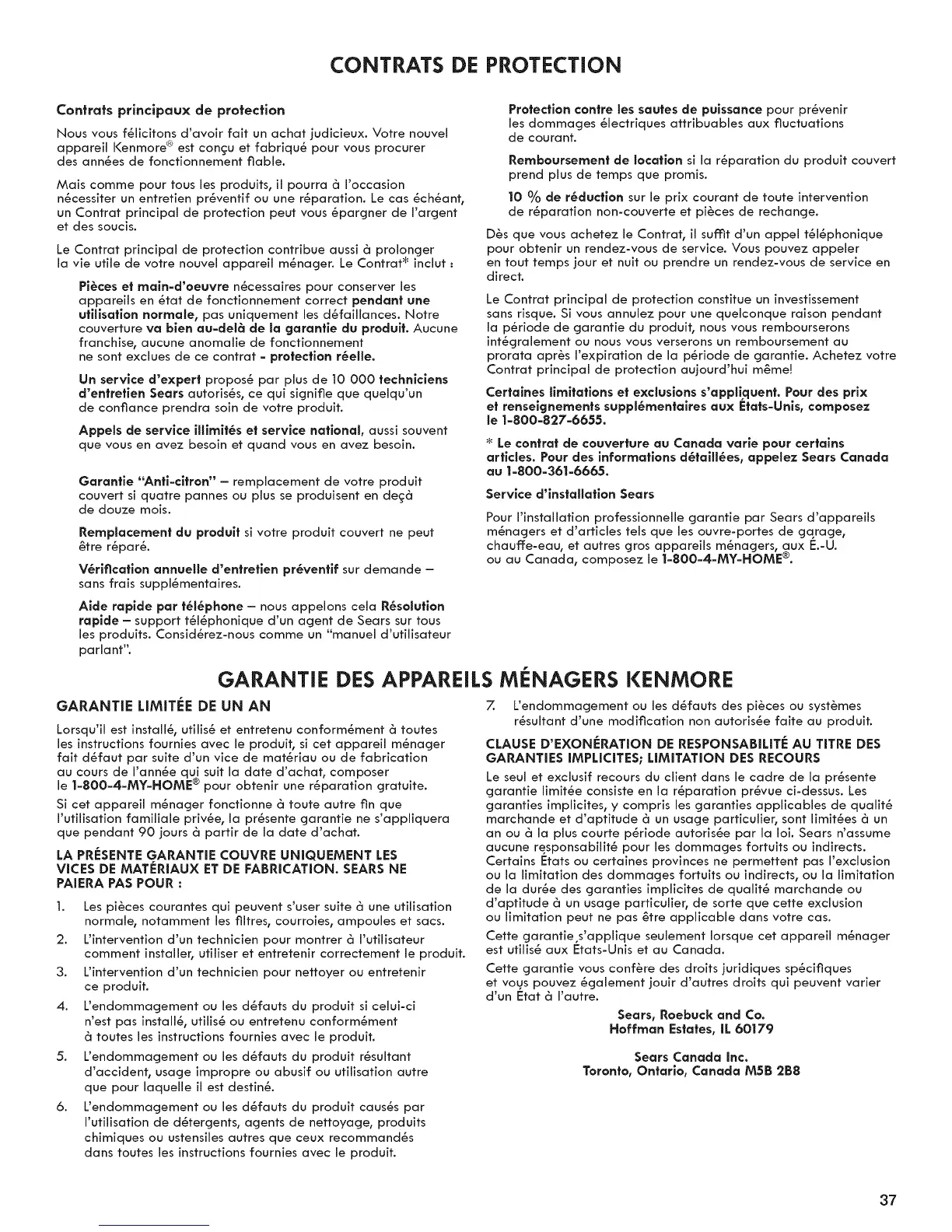 GARANTIE DES APPAREILS MENAGERS KENMORE