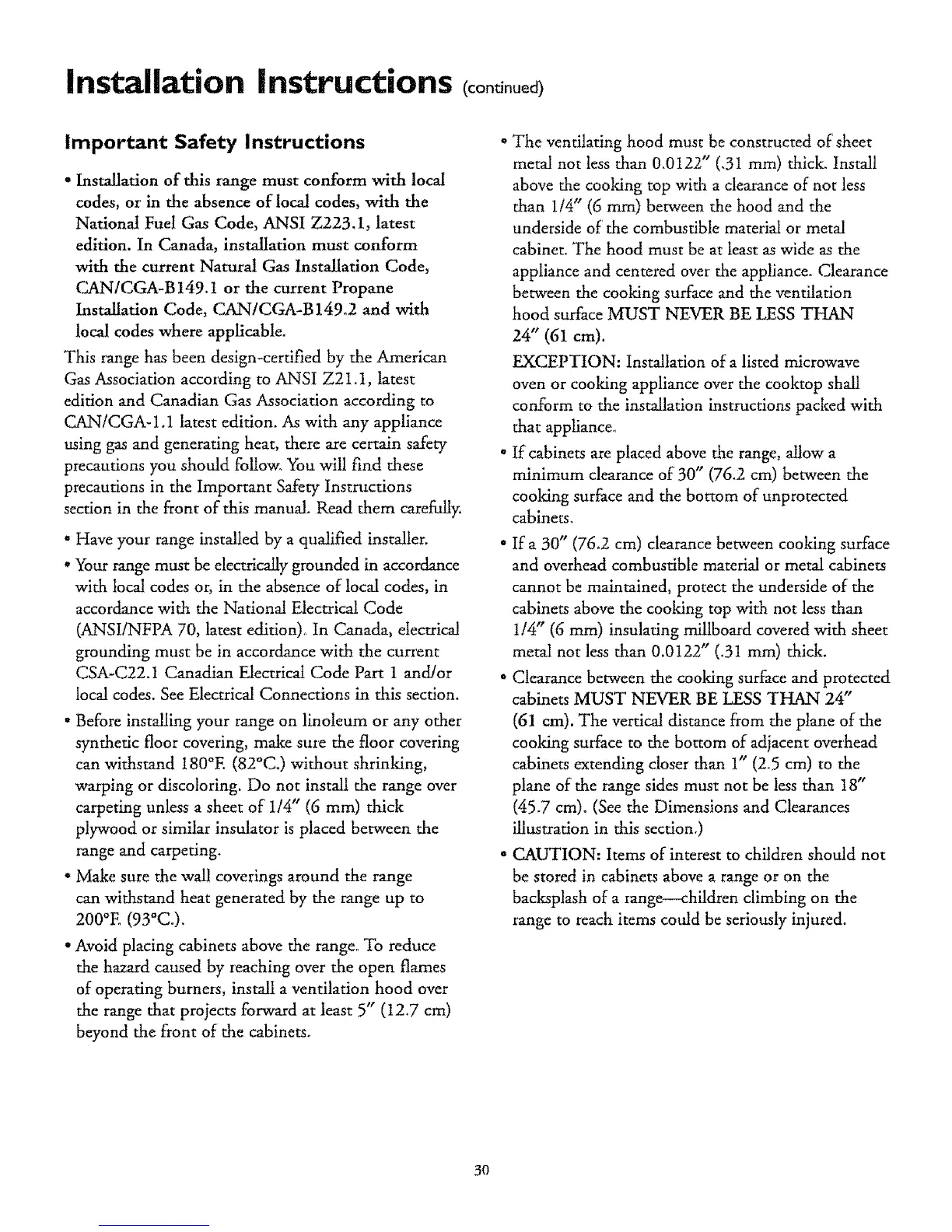 • If a 30" (76.2 cm) clearance between cooldng surface