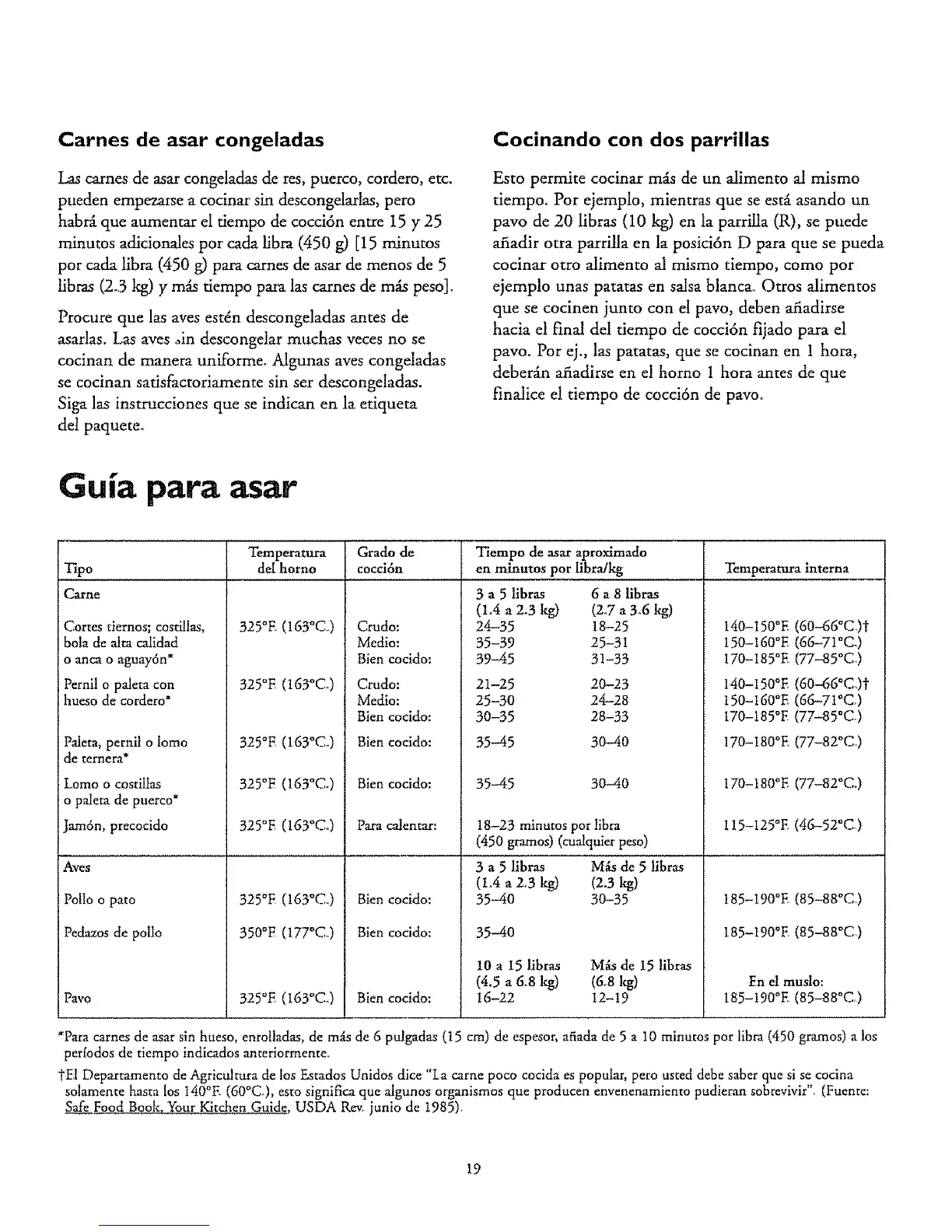 *Para carnes de mar sin hueso, enrolladas, de m_ de 6 pulgadas (15 cm) de espesor, afiada de 5 a 10 minutos pot libra (454 gramos) a los