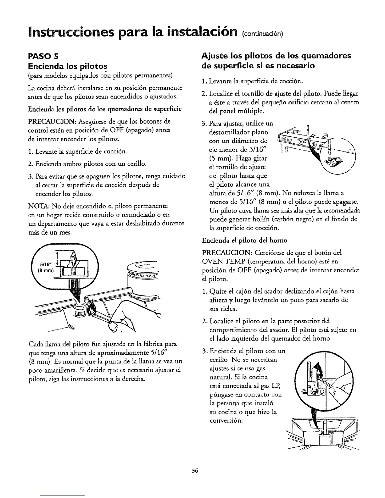 menos de 5/16" (8 ram) o el piloto puede apagarse.