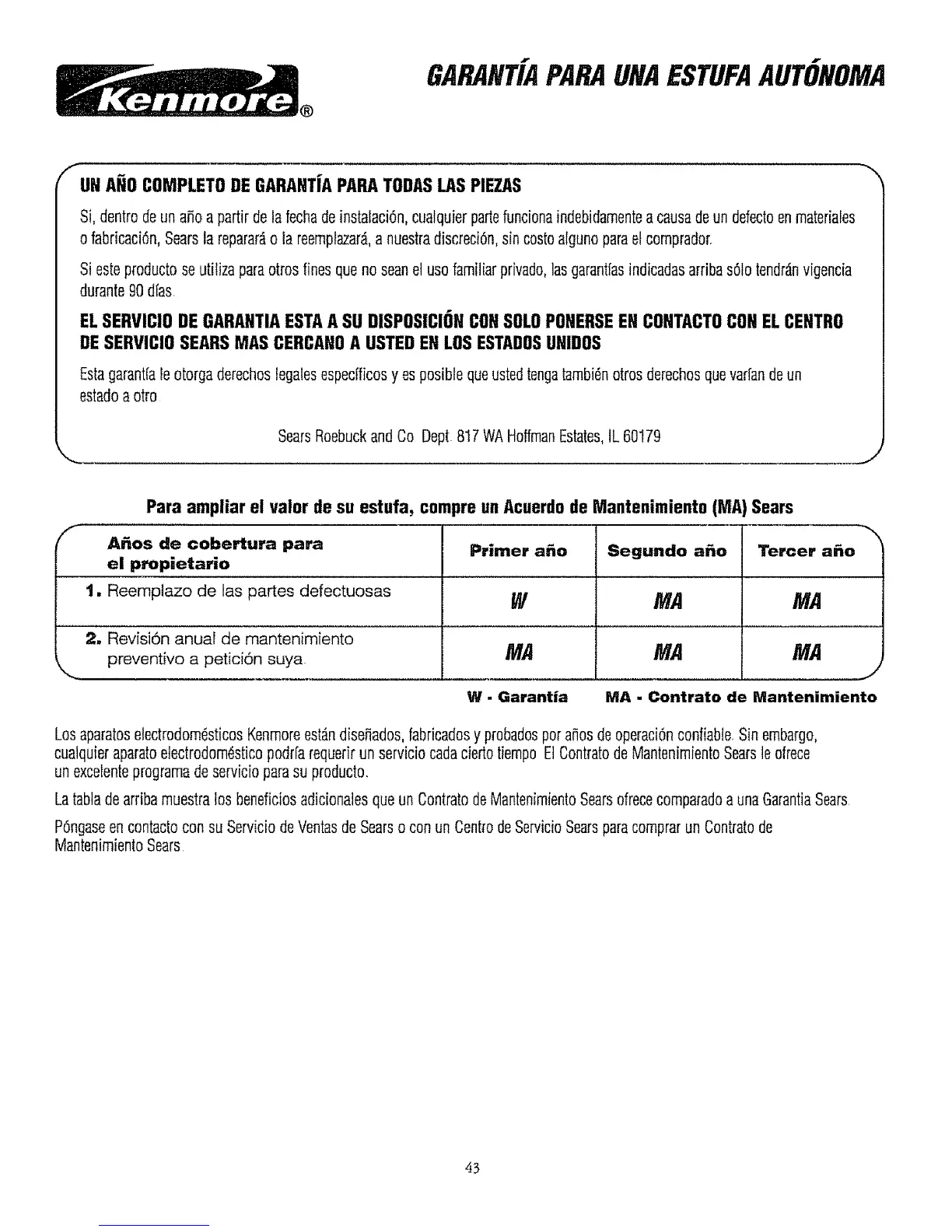 Para ampliar el valor de su estufa, compre un Acuerdo de Mantenimiento (MA) Sears