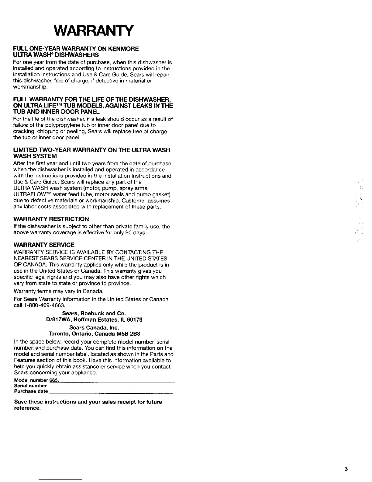 For Sears Warranty information in the United States or Canada