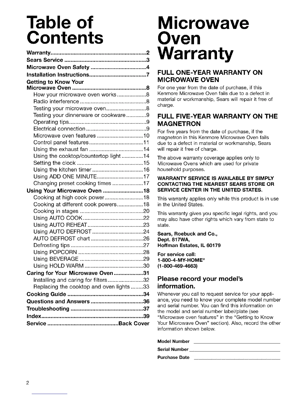 Sears Service ..................................................... 3
