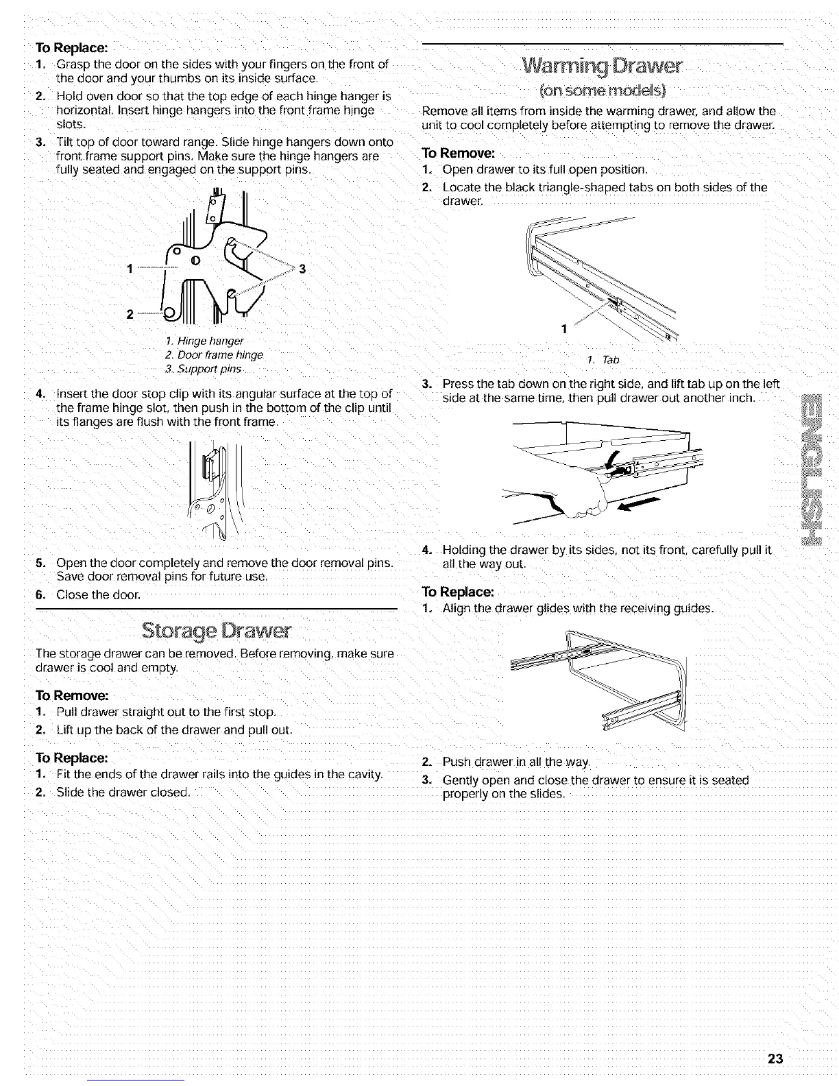3. Tilt tc a of door toward range. Slide hinge hangers down omo
