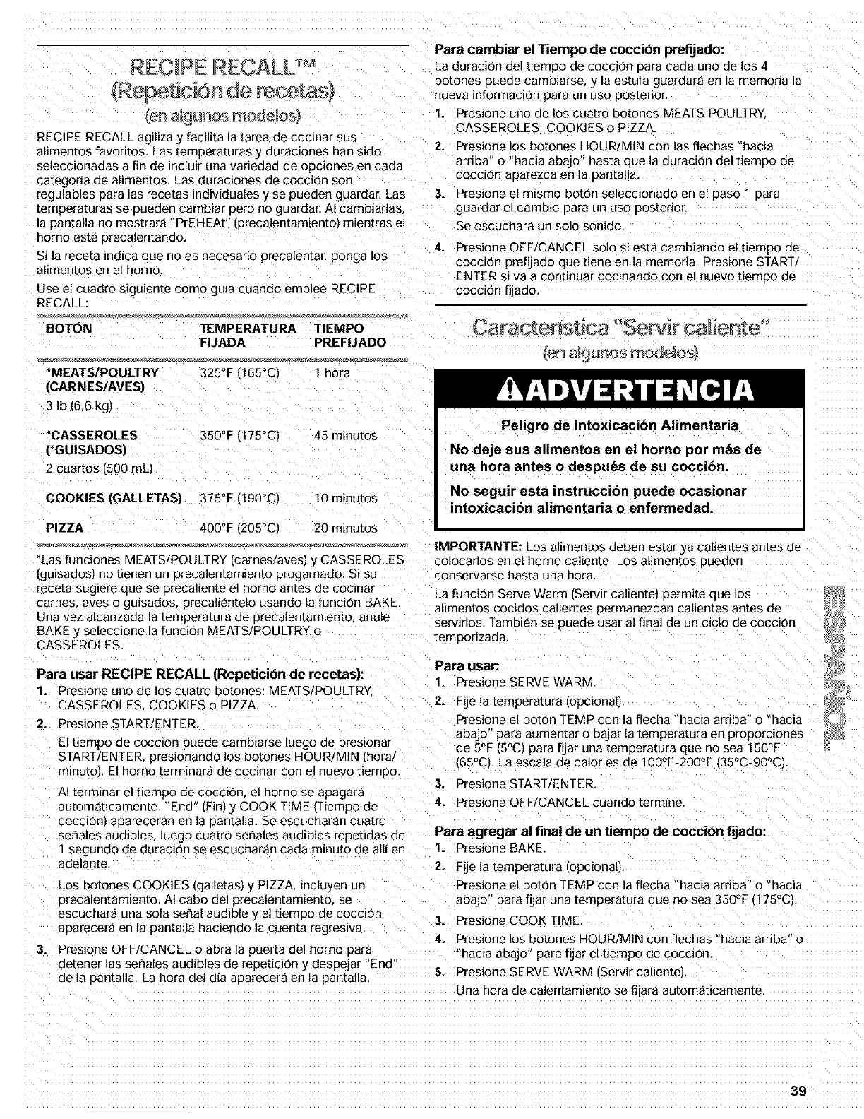 La funcion Serve Warm lServir caliente} permite que los