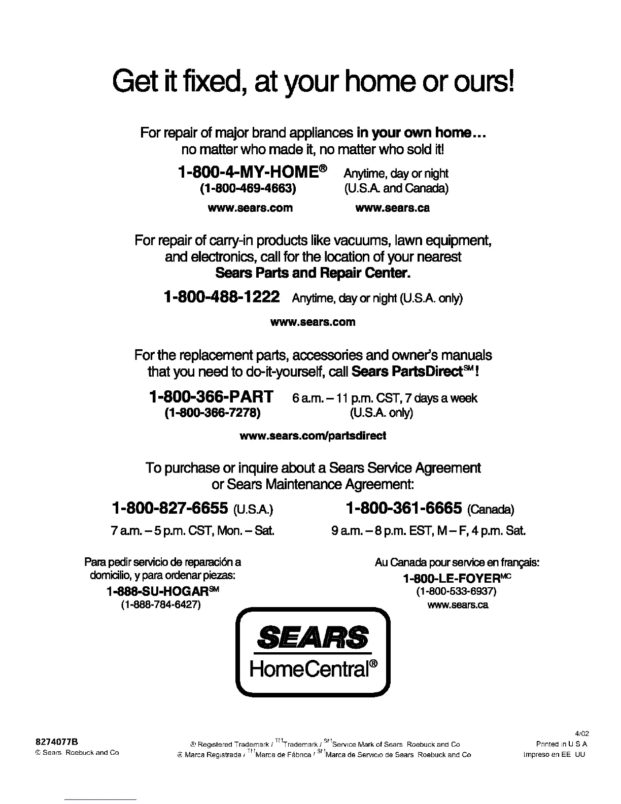 _' Registered Trademark / Trademark ! Service Mark of Sears Roebuck and Co Printed LnU S A