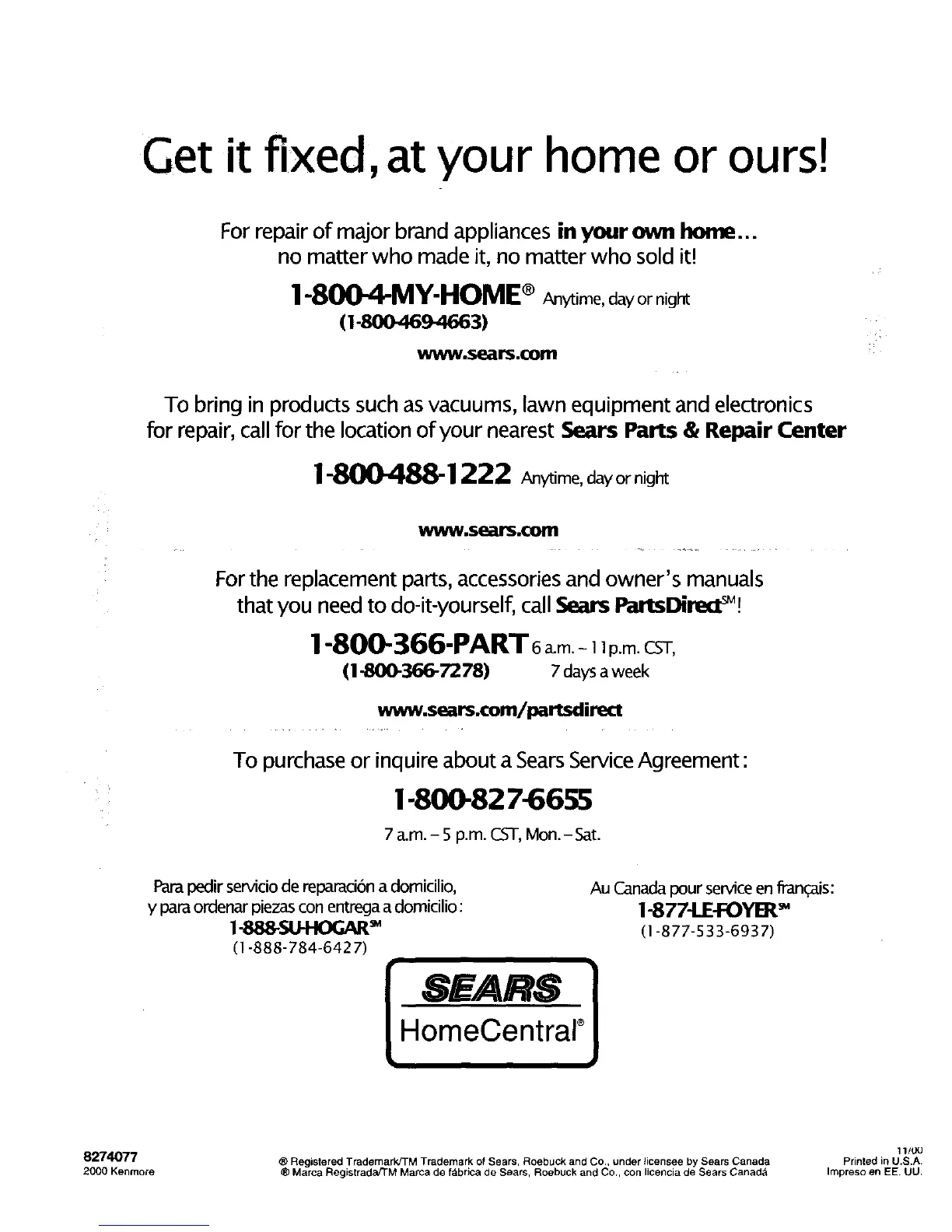 8274077 ® Registered Trademark/TM Trademark of Sears, Roebuck and Co., under licensee by Sears Canada Printed in U.S.A.