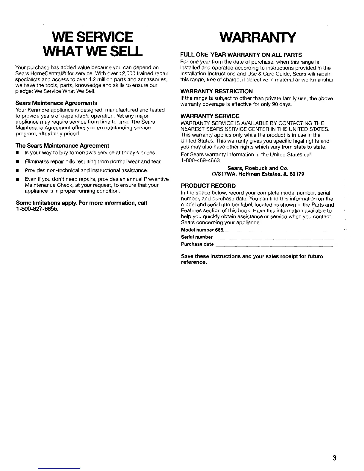 Installation Instructions and Use & Care Guide, Sears will repair