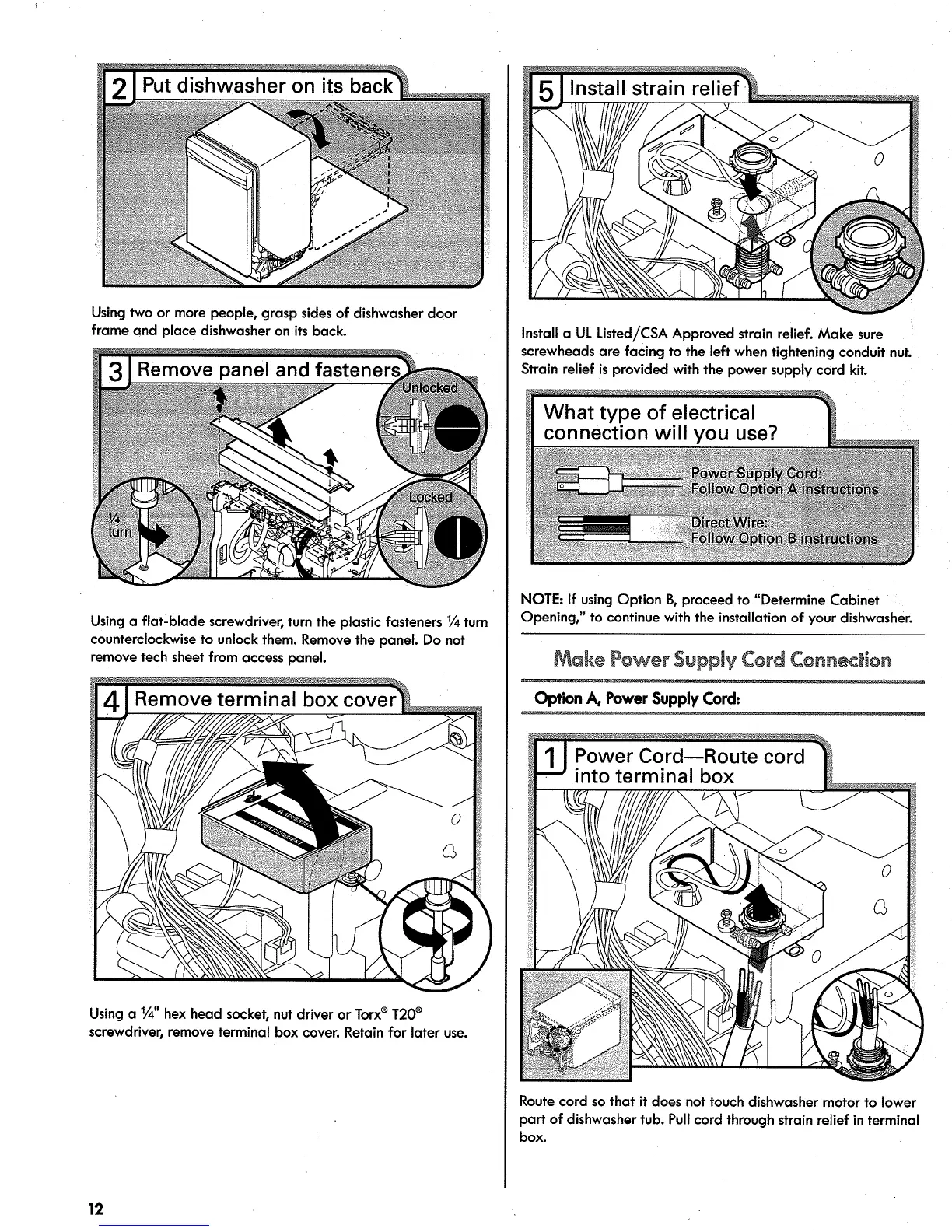 part of dishwasher tub. Pull cord through strain relief in terminal