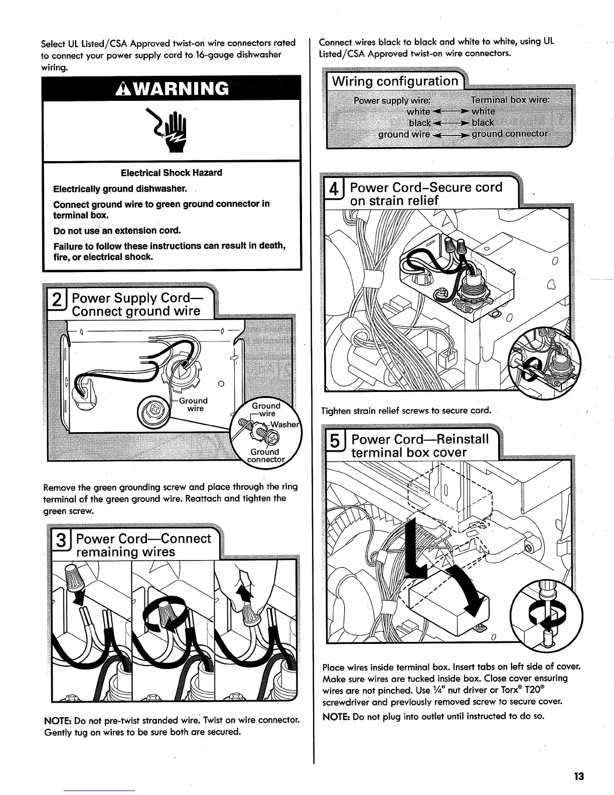 to connect your power supply cord to 16-gauge dishwasher