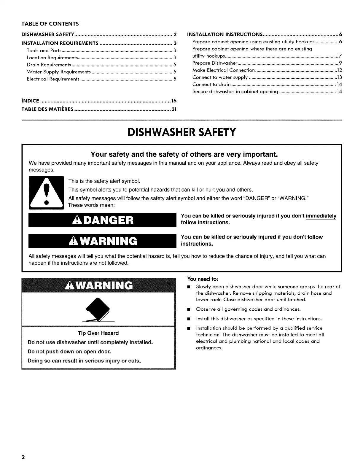 Kenmore 66513734K604 - English; Table of Contents; Dishwasher Safety