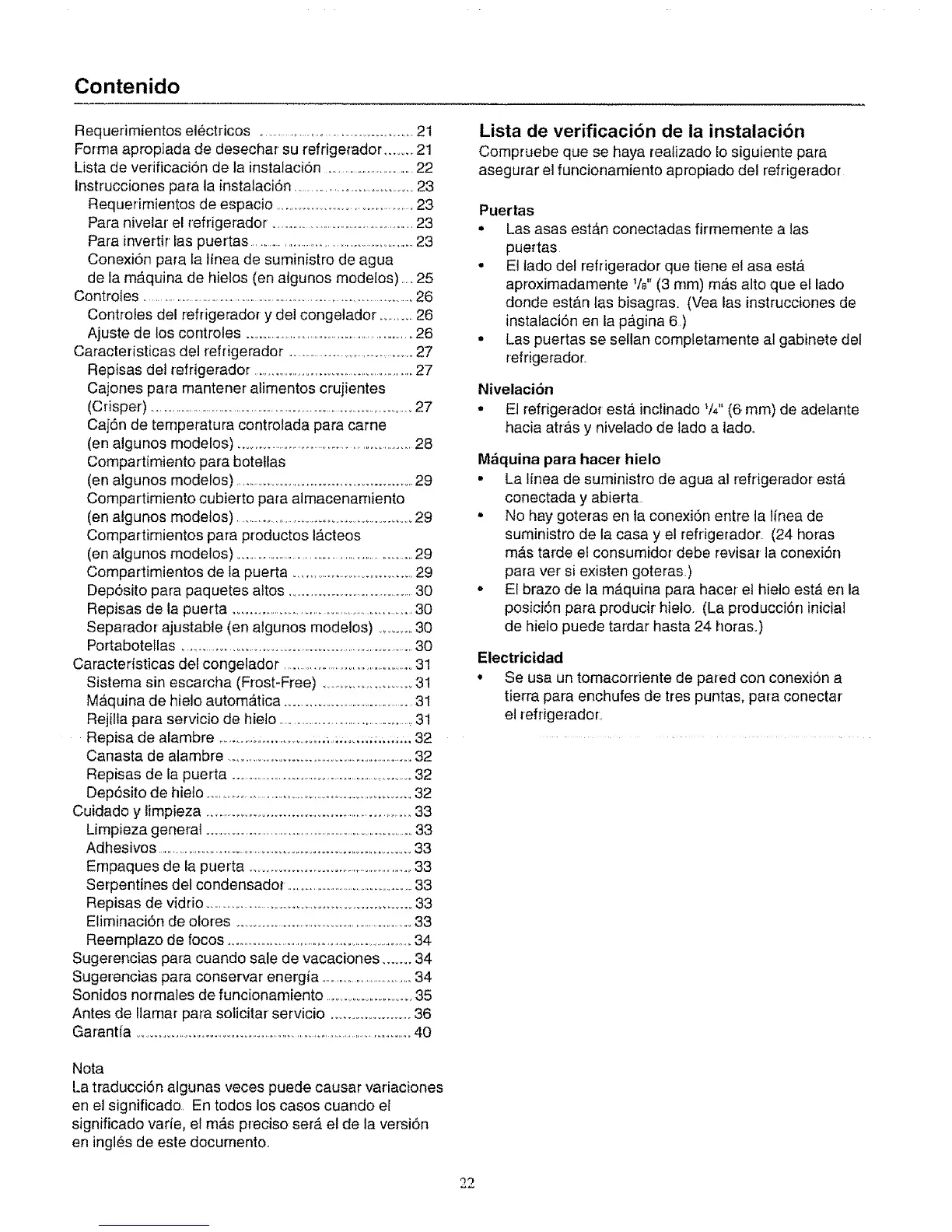 Lista de verificacion de la instalaci6n .................................22