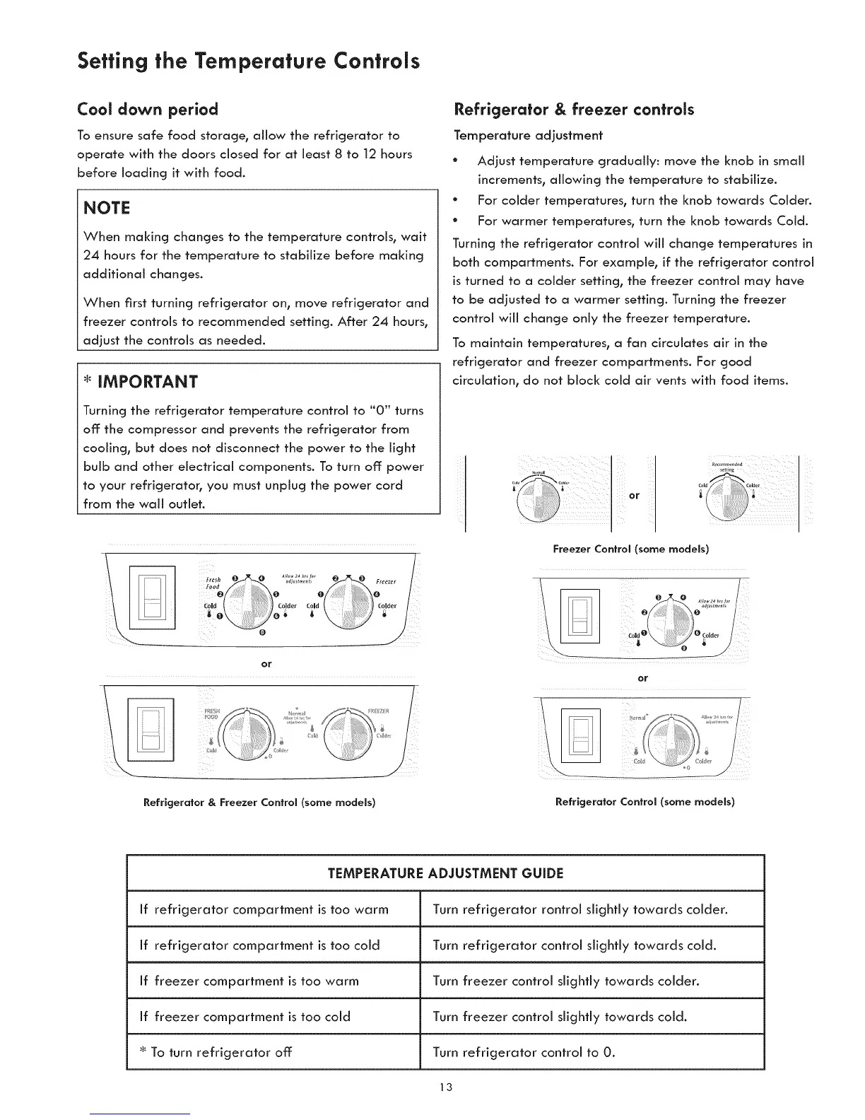 If refrigerator compartment is too cold Turn refrigerator control slightly towards cold.