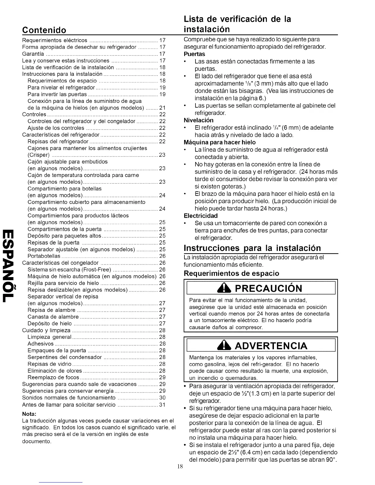 Caracteristicas del refrigerador ..................................... 22