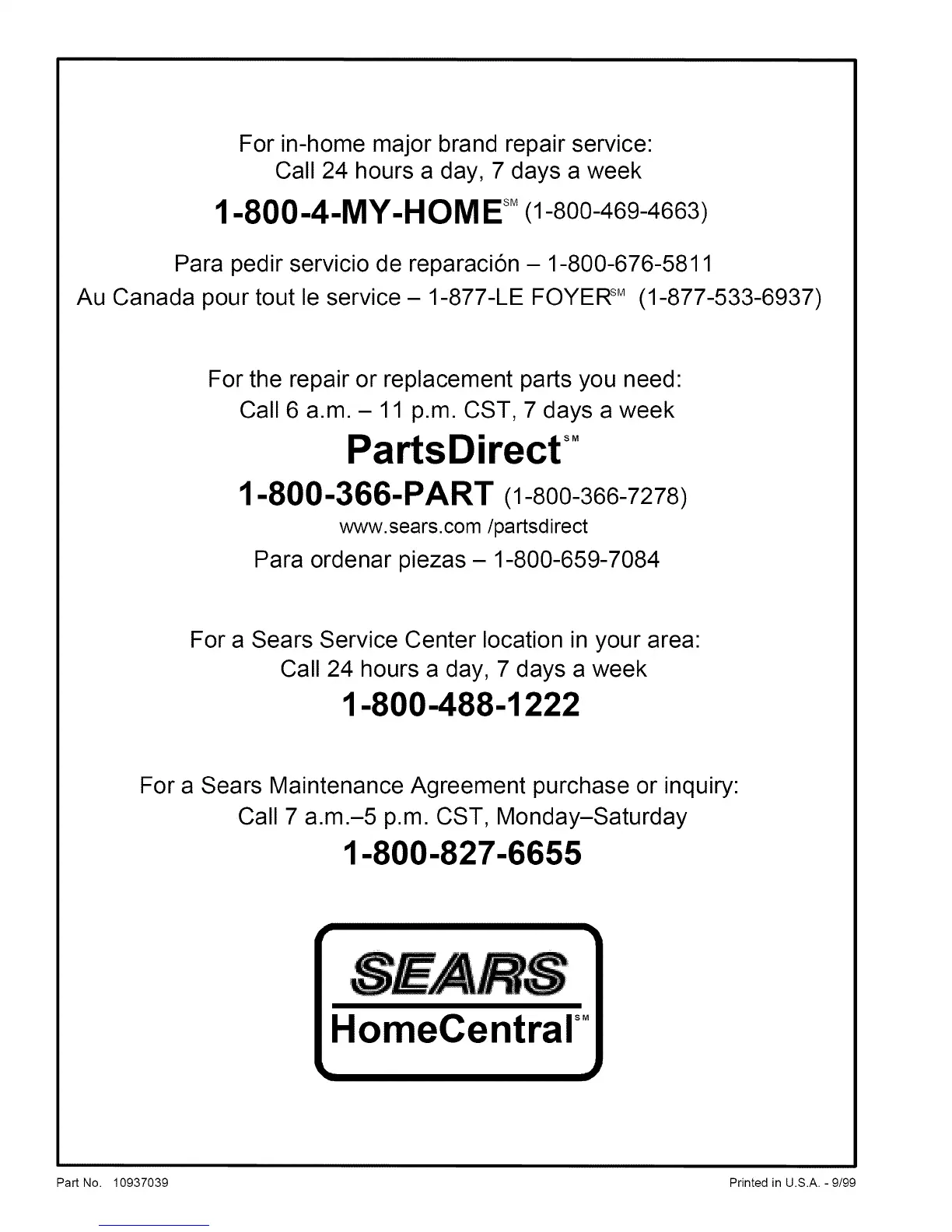 Part No. 10937039 Printed in U.S.A. - 9/99