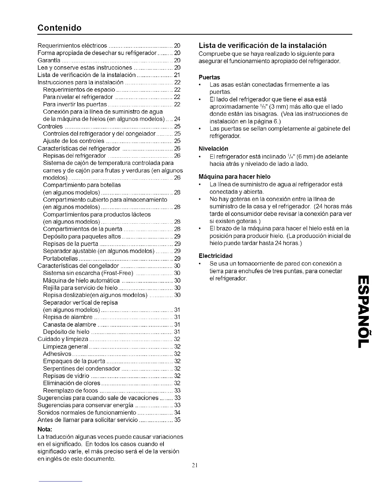 de Ia maquina de hielos (en algunos modetos) .... 24