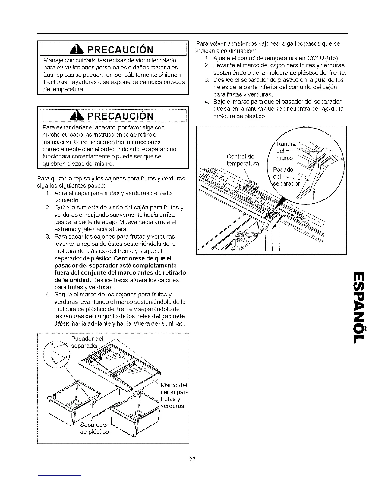 Para volver a meter los cajones, siga Ios pasos que se