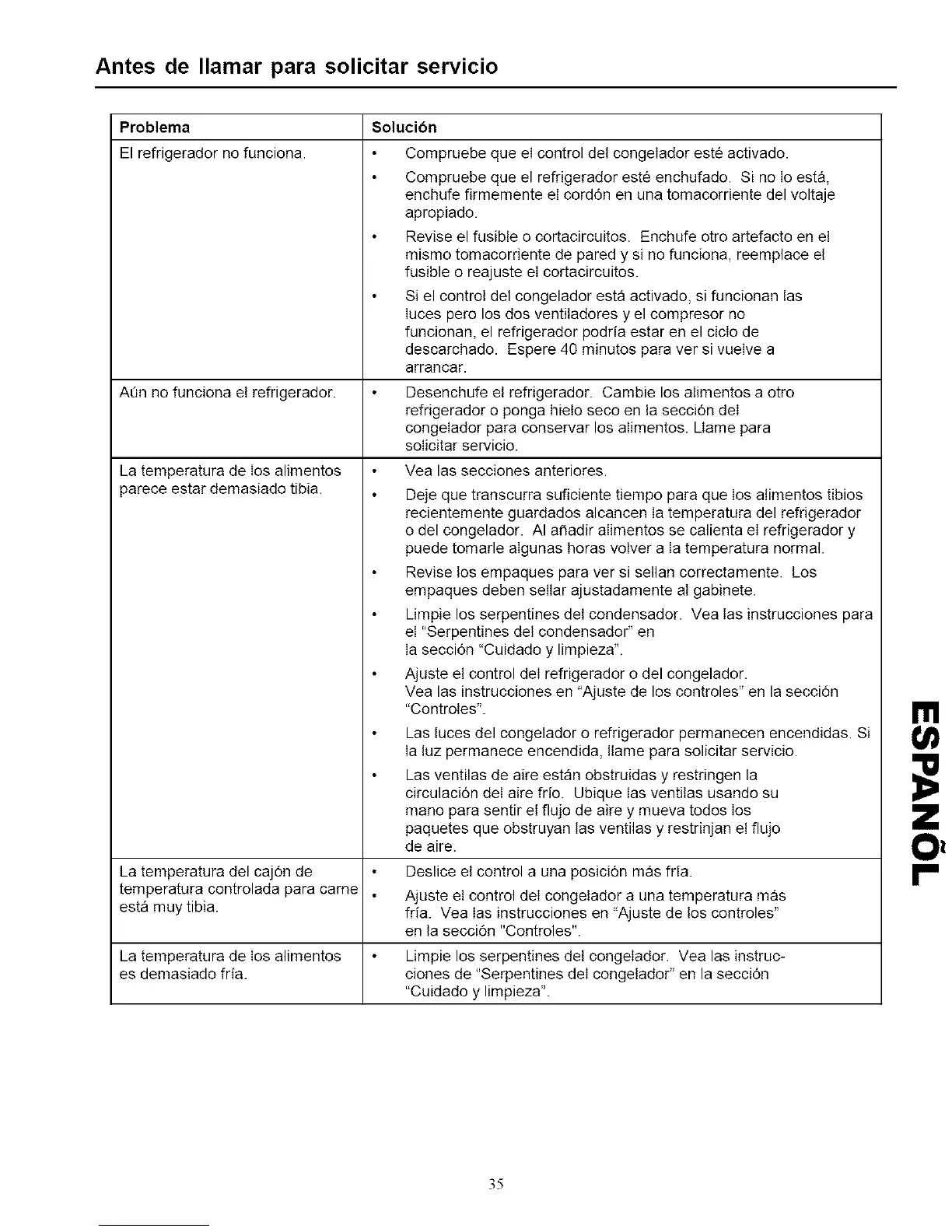 esta muy tibia, fria. Vea Ias instrucciones en "Ajuste de los controles"