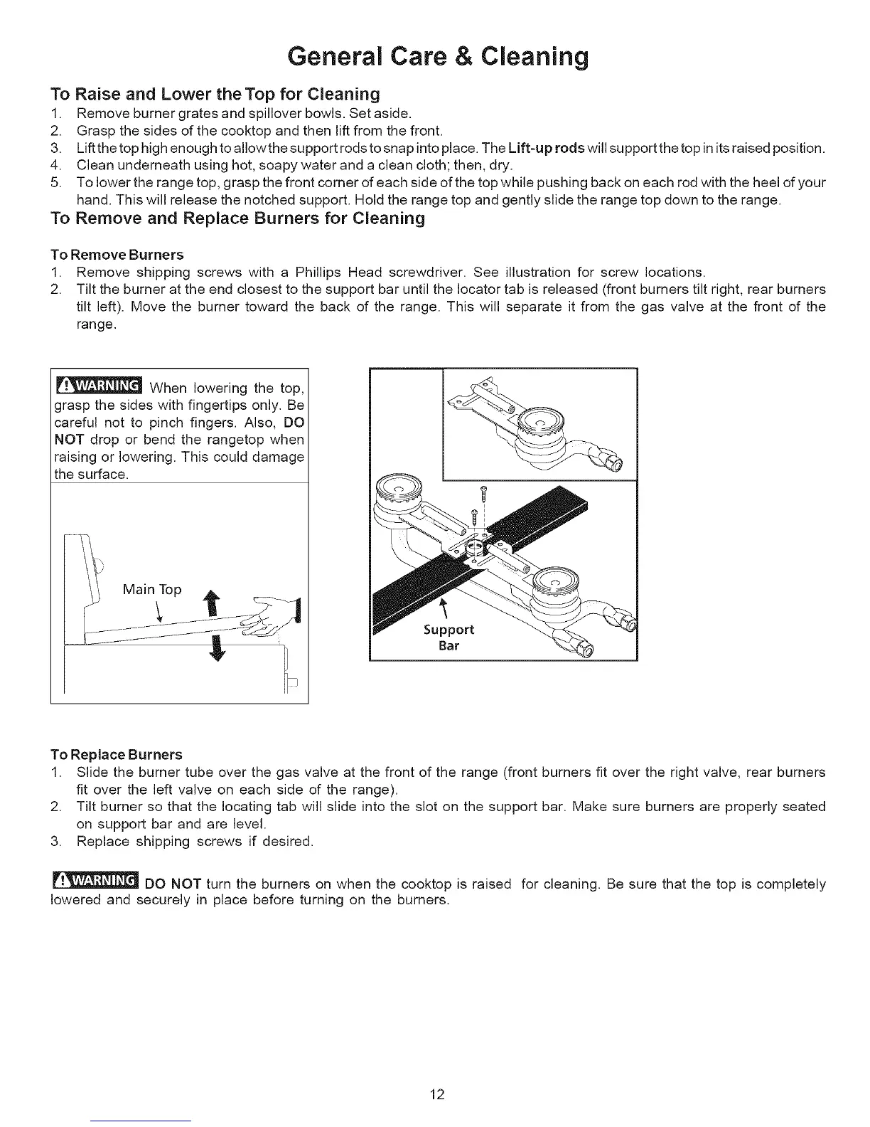 DO NOT turn the burners on when the cooktop is raised for cleaning. Be sure that the top is completely