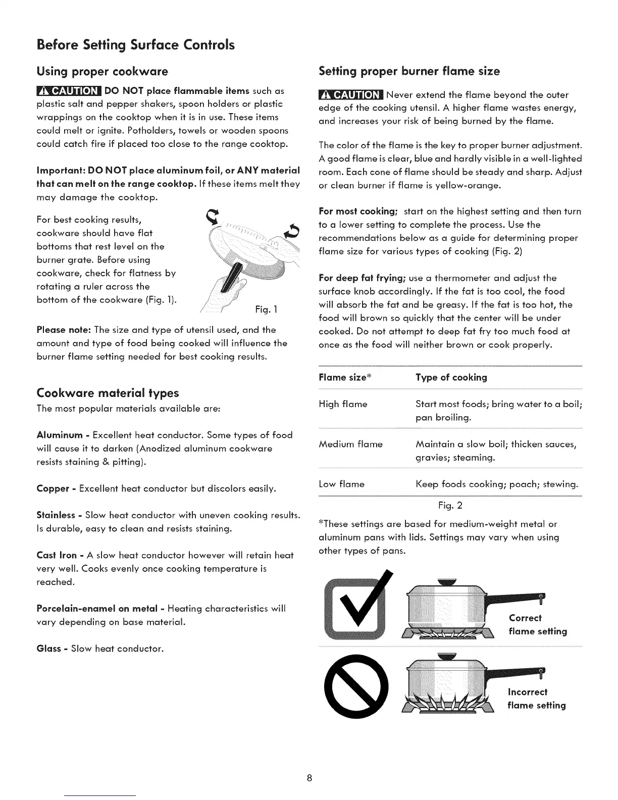 flame size for various types of cooking (Fig. 2)
