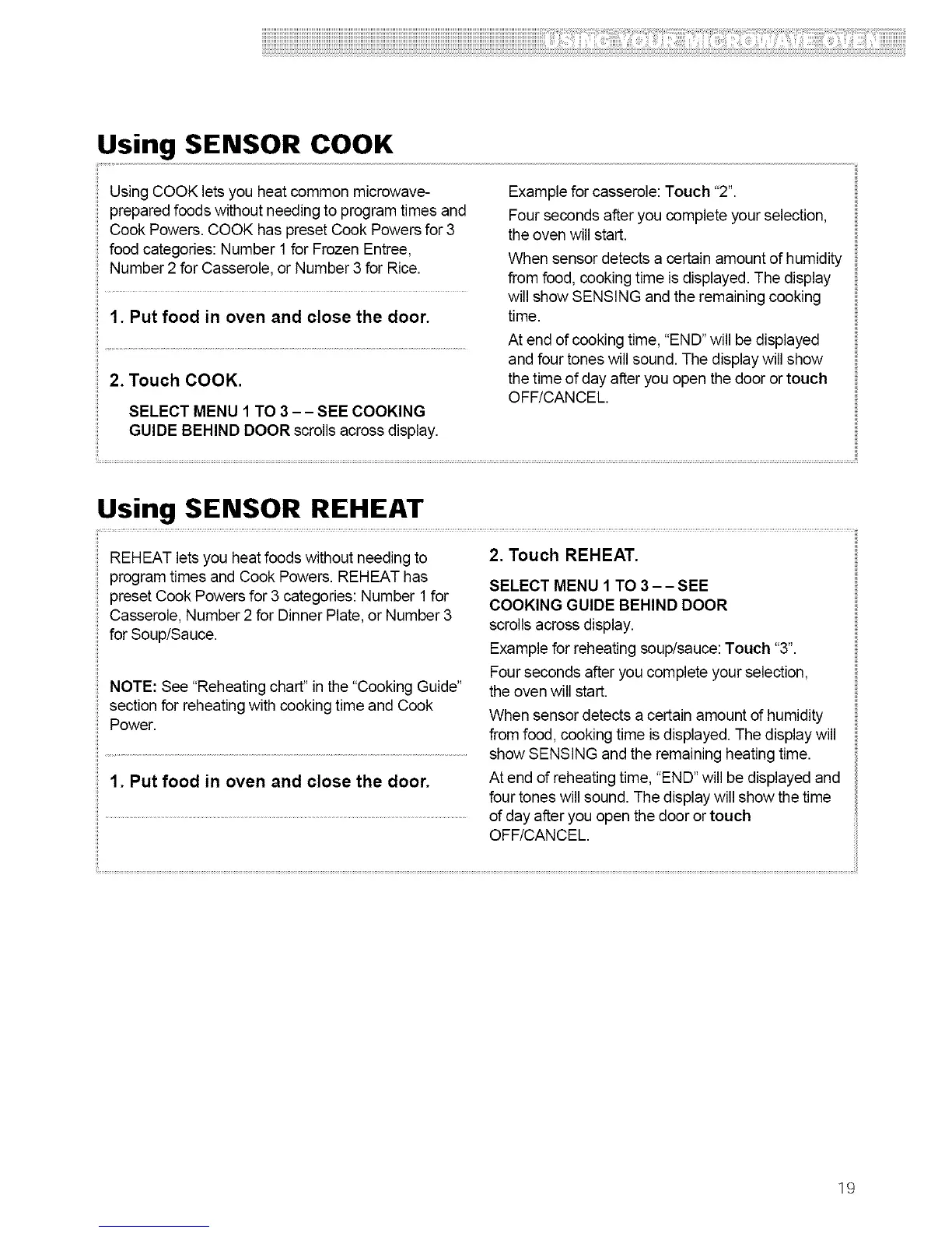 NOTE: See "Reheating chart" in the "Cooking Guide"