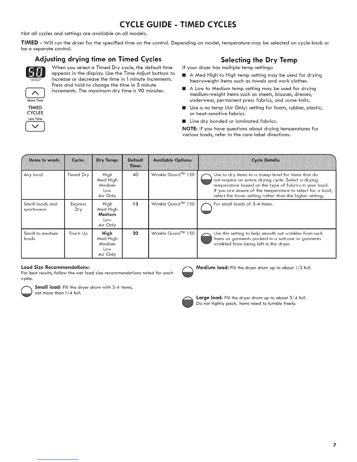 TIMED - Will run the dryer for the specified time on the control. Depending on model, temperature may be selected on cycle knob or
