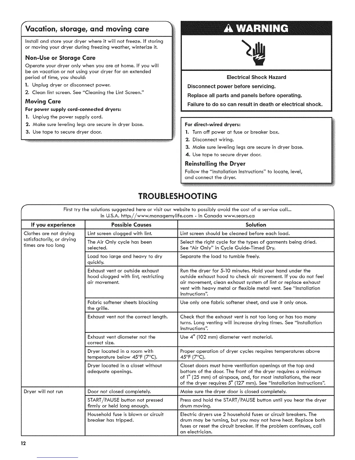 or moving your dryer during freezing weather, winterize it.