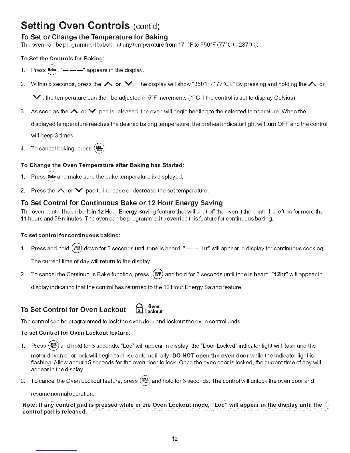 Note: If any control pad is pressed while in the oven Lockout mode, !'Loc', will appear inthe display until the
