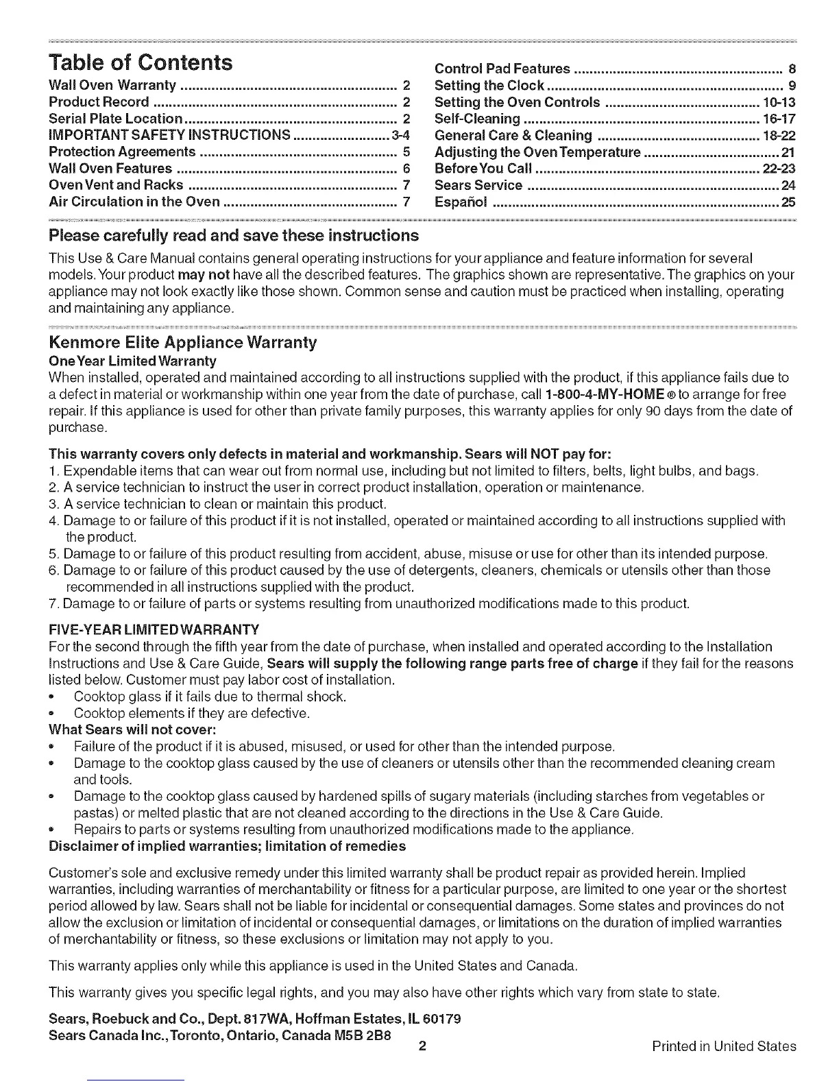 Wall Oven Warranty ........................................................ 2