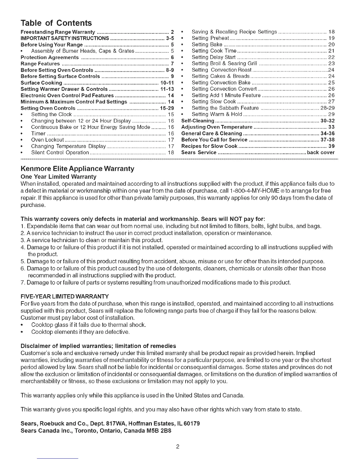 Sears Service ............................................................ back cover
