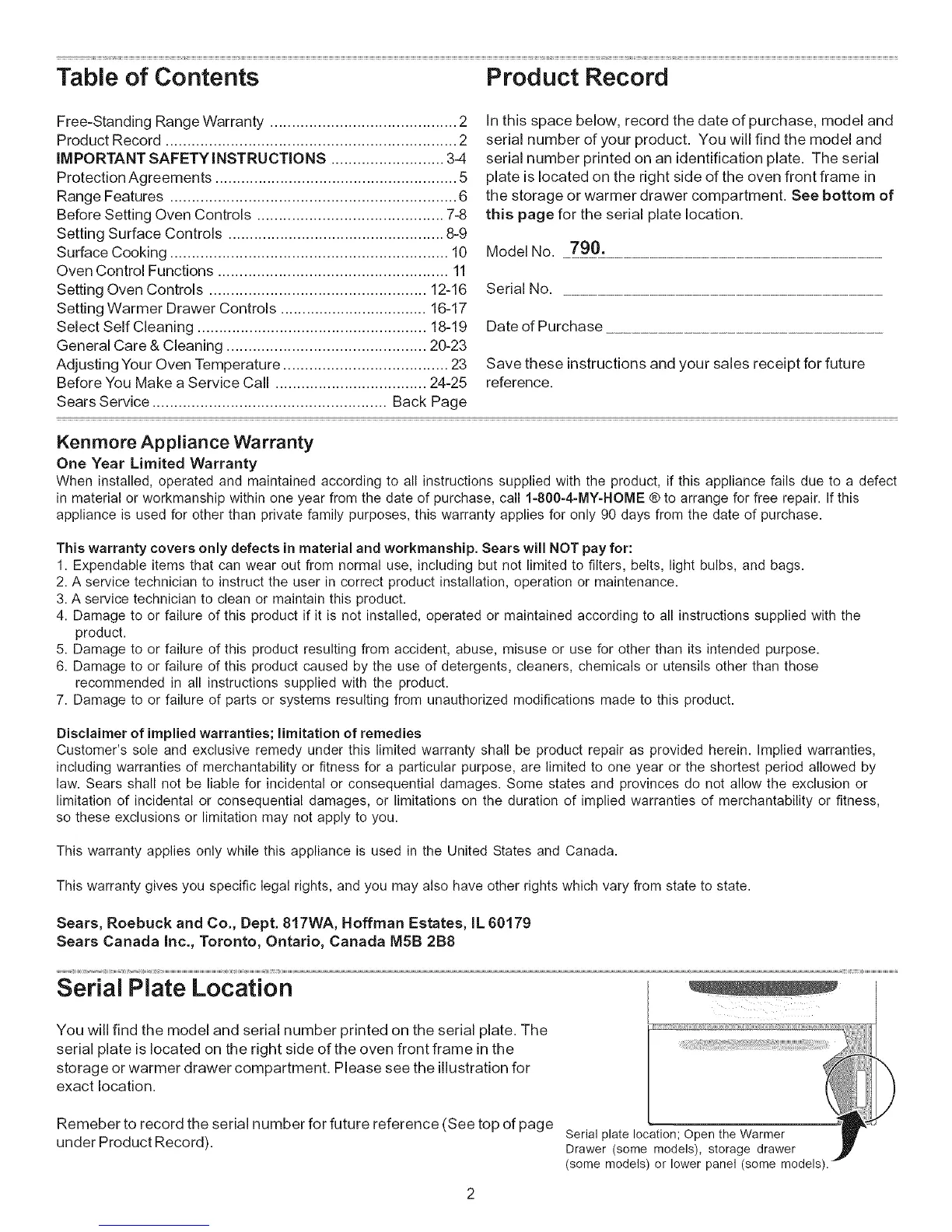Free-Standing Range Warranty ........................................... 2