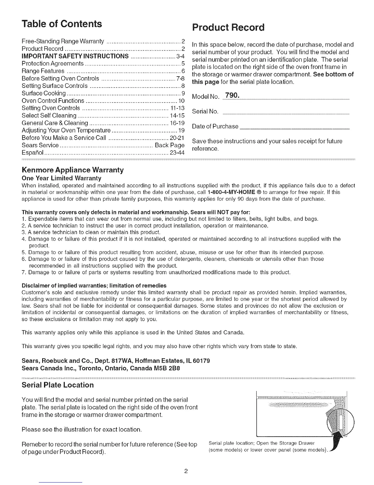 Free-Standing Range Warranty ........................................... 2