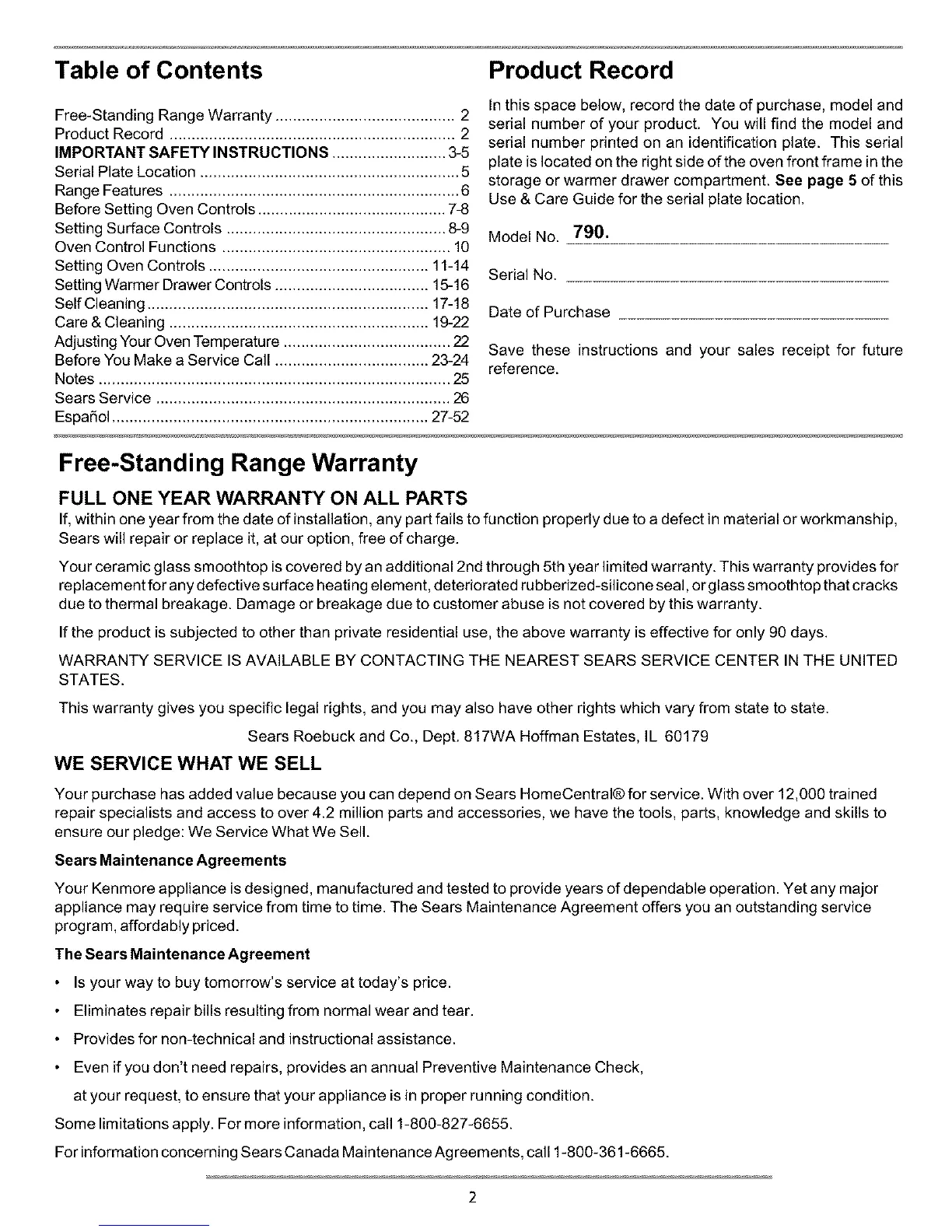 Free-Standing Range Warranty ......................................... 2