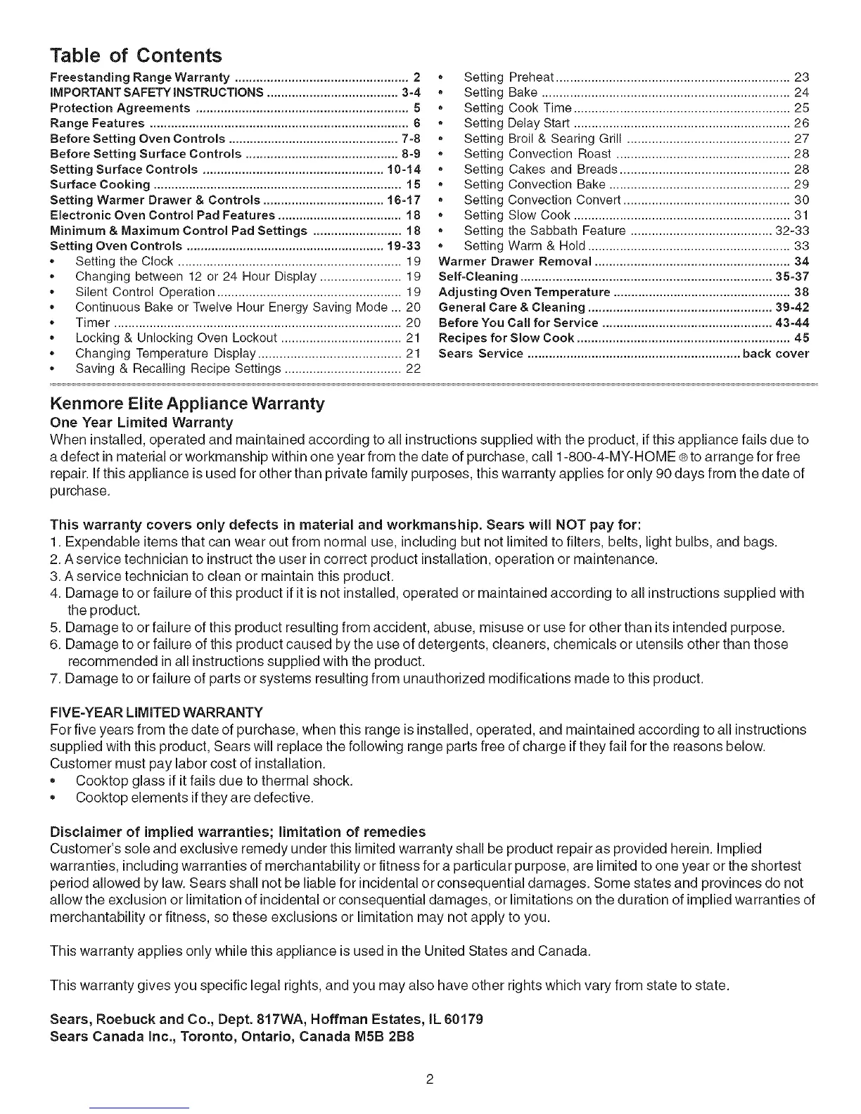 Sears Service ............................................................ back cover