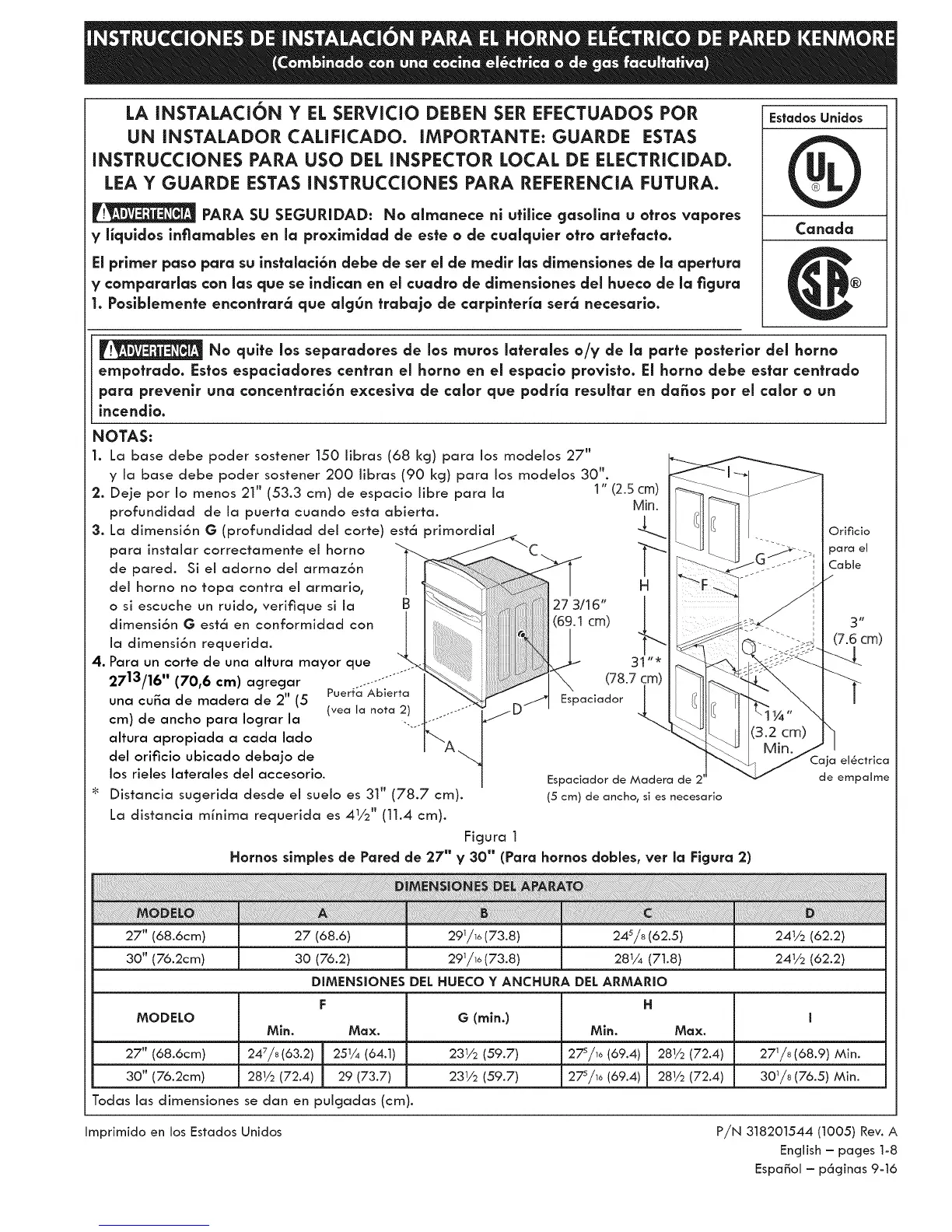 Hornos simpJes de Pared de 27" y 30" (Para hornos dobJes, vet la Figura 2)