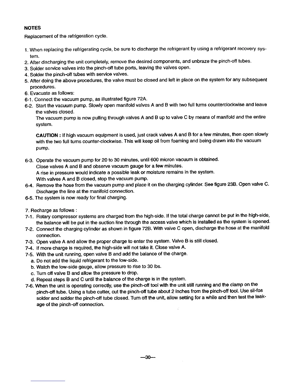 7-2. Connect the charging cylinder as shown in figure 72B. With valve C open, discharge the hose at the manifold