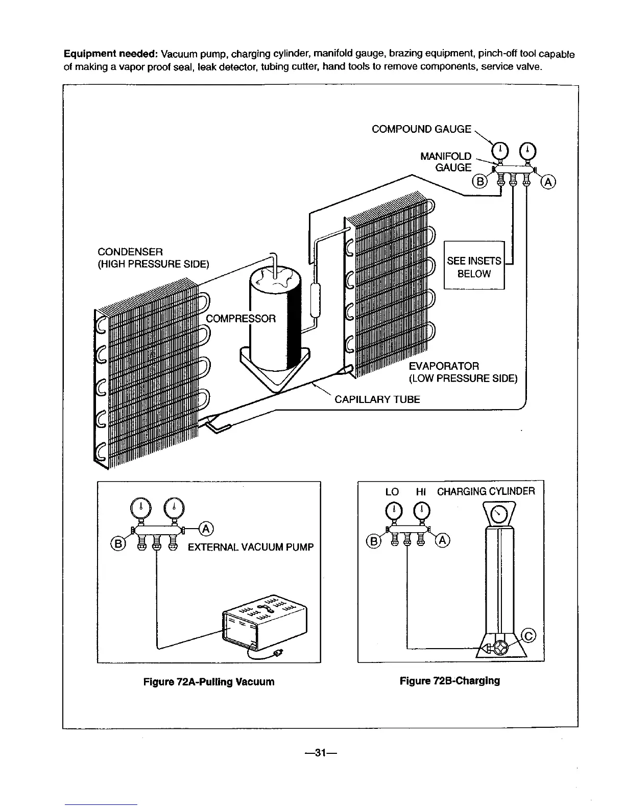 Equipment needed: Vacuum pump, charging cylinder, manifold gauge, brazing equipment, pinch-off tool capable