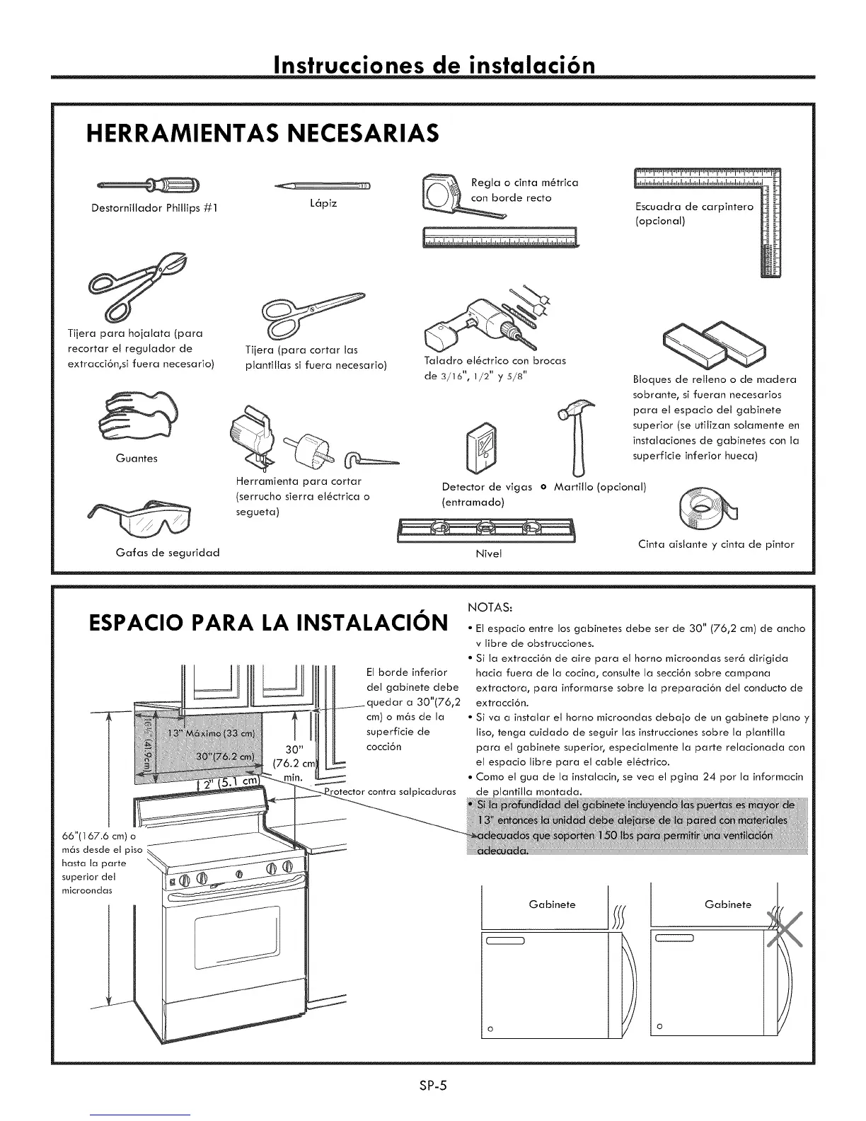 El espacio entre los gabinetes debe ser de 30" (76,2 cm) de ancho