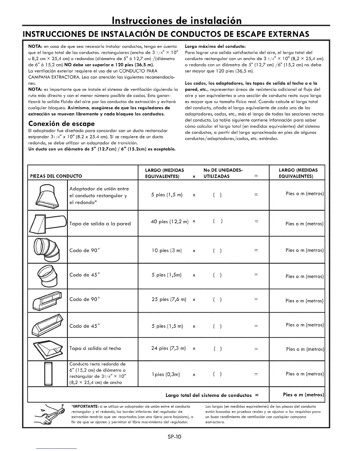 que eJ largo total de los conductos, rectanguJares (ancho de 3 I/4" x I 0"