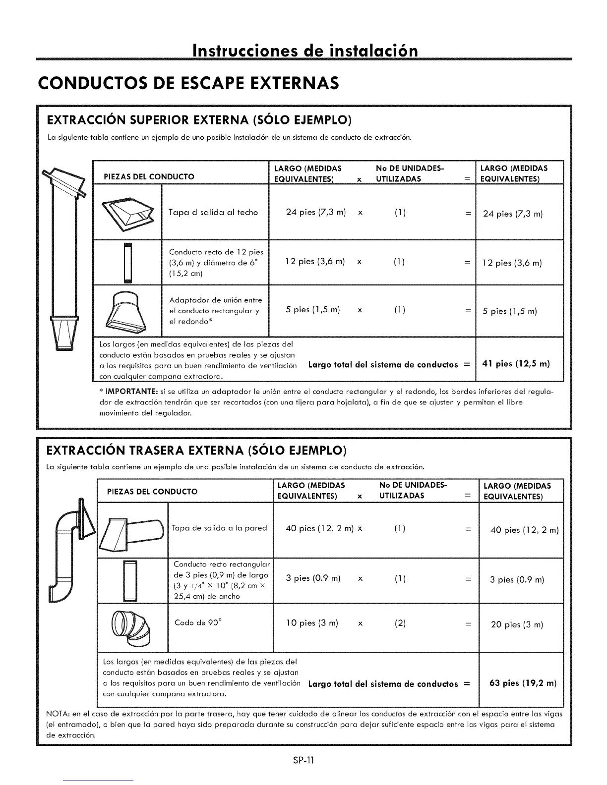 La siguiente tabla contiene un ejemplo de uno posible instalaci6n de un sistema de conducto de extracci6n.