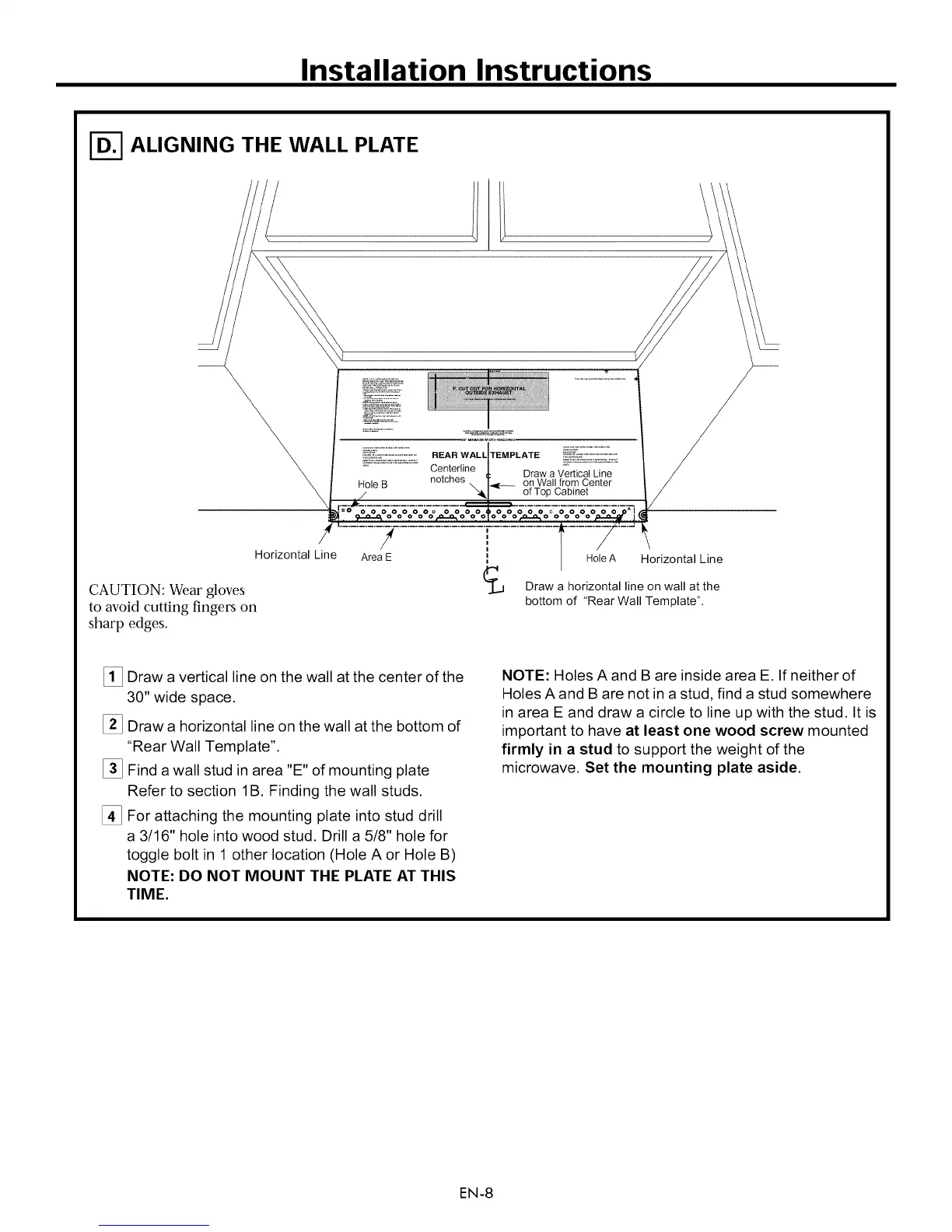 [_ Find a wall stud in area "E" of mounting plate