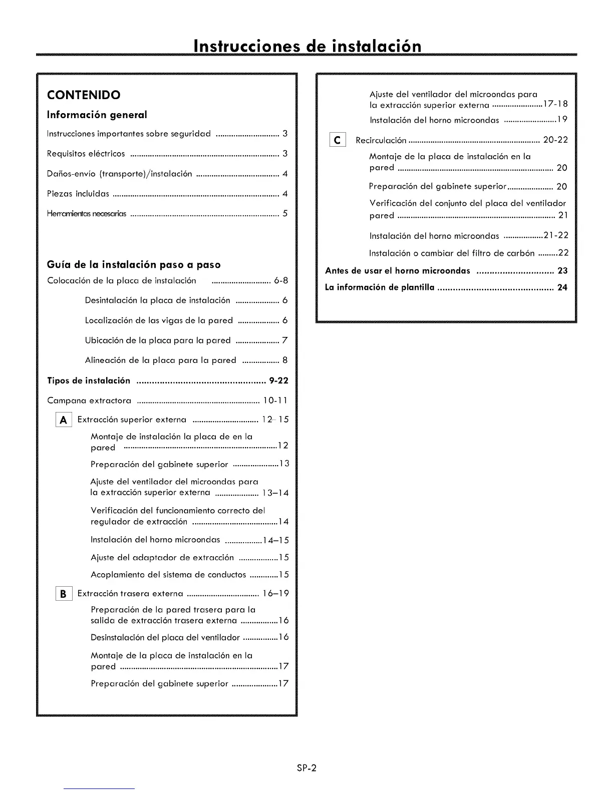 Instalaci6n o cambiar del filtro de carb6n ......... 22