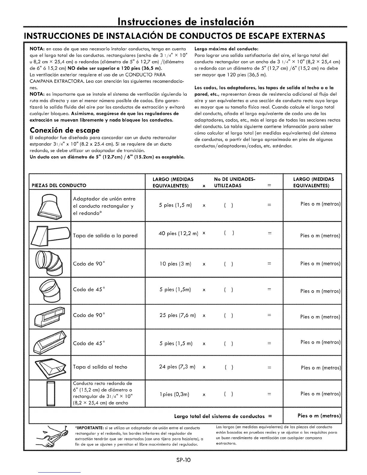 que eJ largo total de los conductos, rectanguJares (ancho de 3 I/4" x I 0"