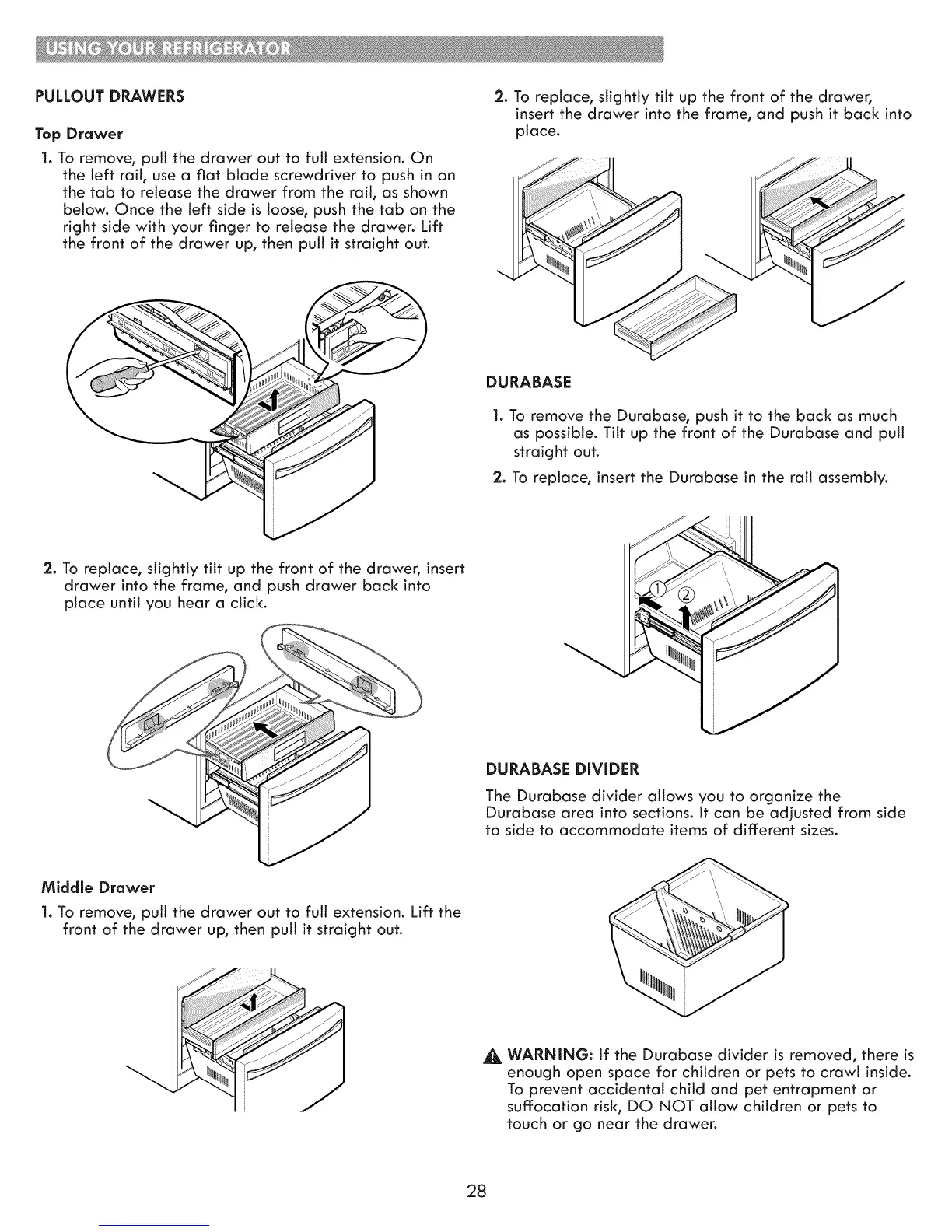 2. To replace, slightly tilt up the front of the drawer,