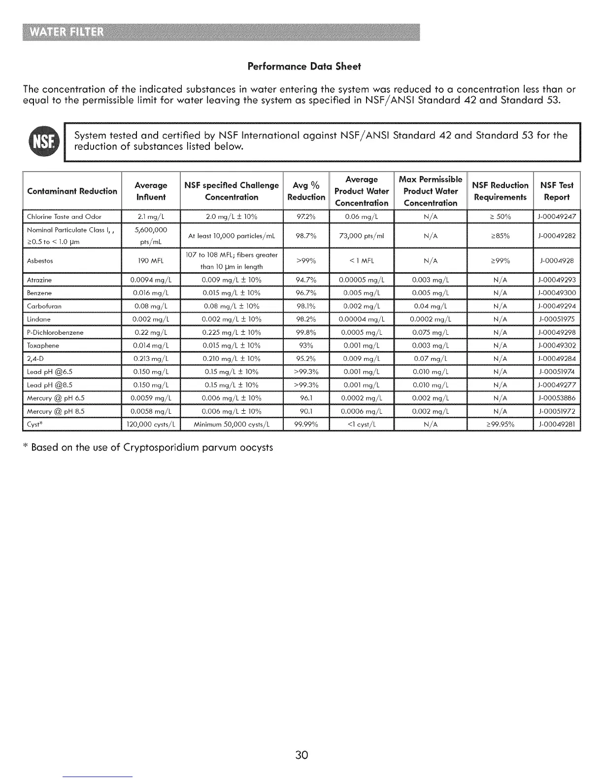 Contaminant Reduction Average NSF specified Challenge Avg % Product Water Product Water