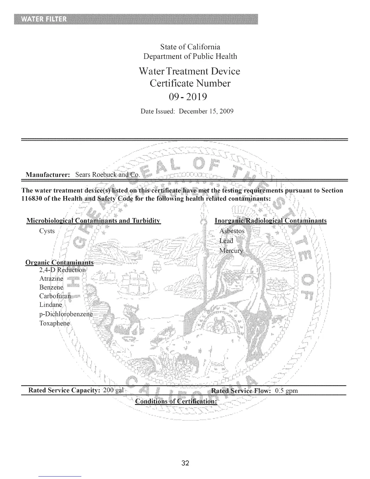The water treatment device(s) listed on this eerfificale have met the testing requirements pursuant to Section