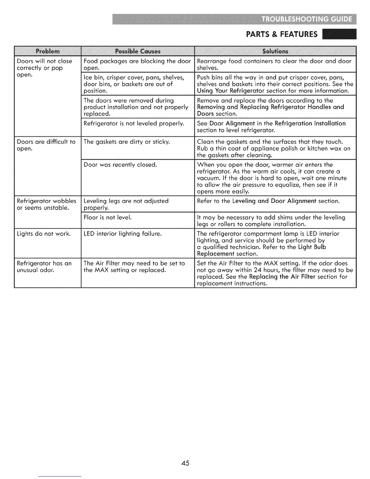 Doors are difficult to The gaskets are dirty or sticky. Clean the gaskets and the surfaces that they touch.