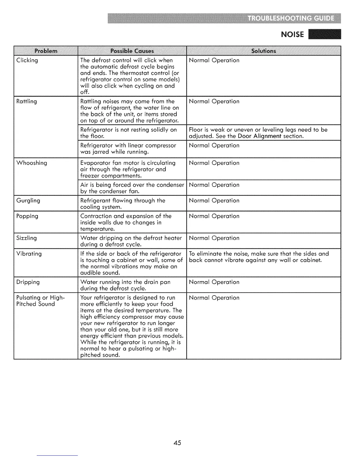 Vibrating If the side or back of the refrigerator To eliminate the noise, make sure that the sides and