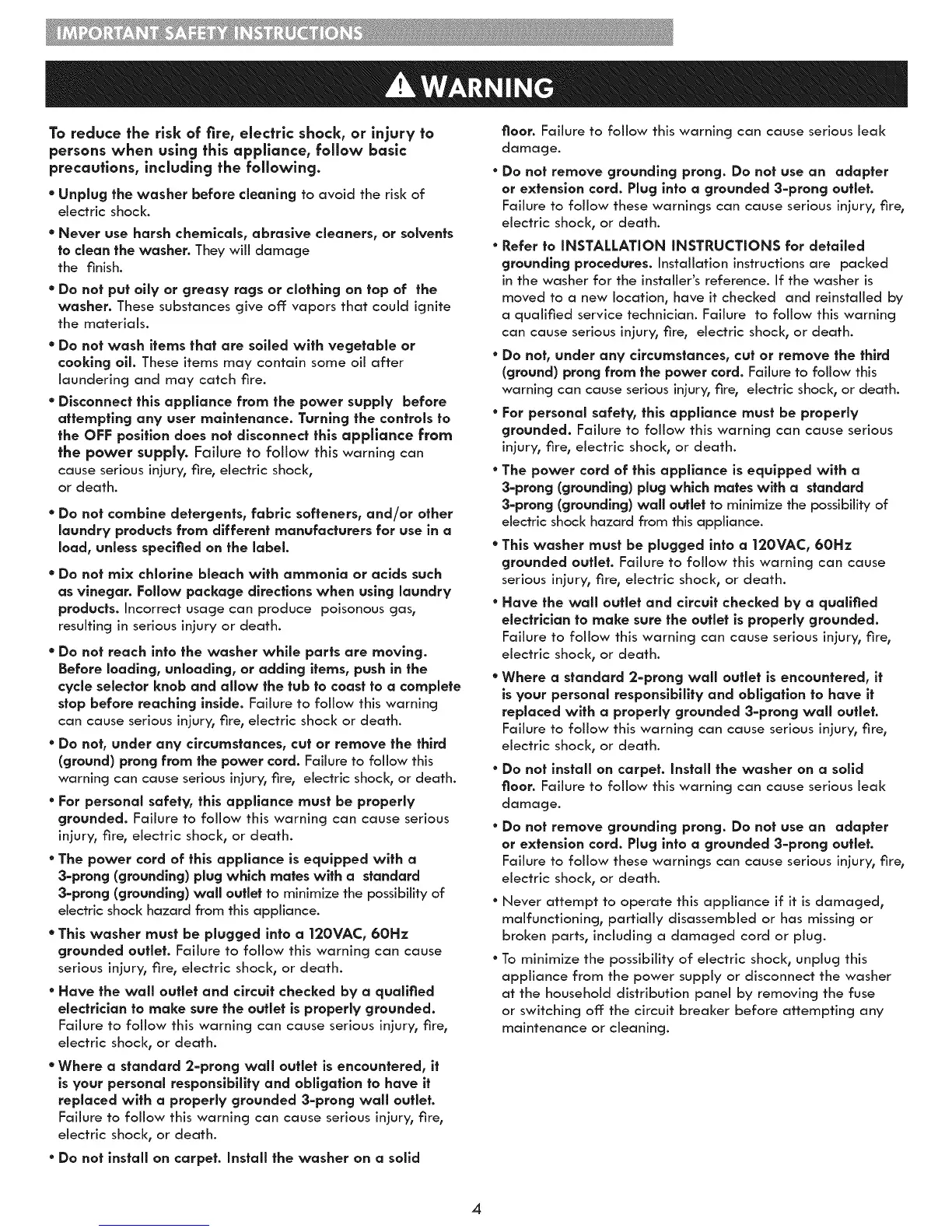 ° This washer must be plugged into a |20VAC, 60Hz