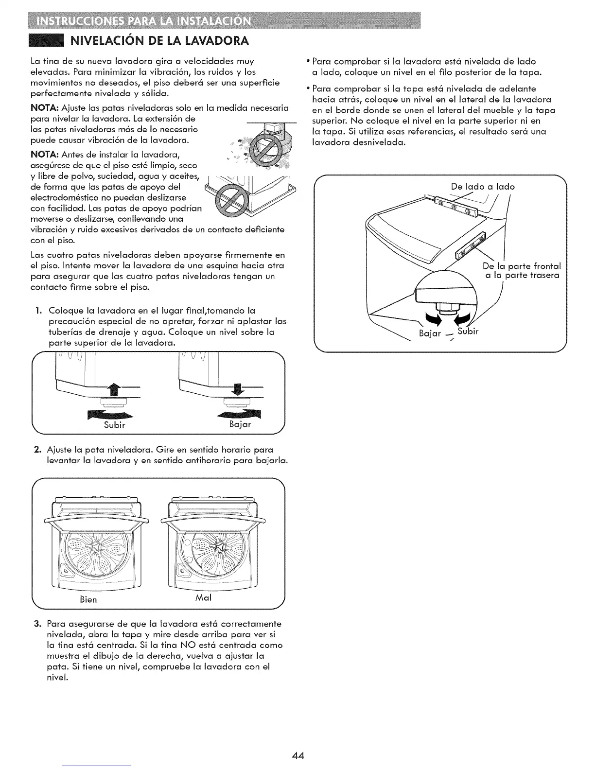° Para cornprobar si ia iavadora est6 niveiada de iado